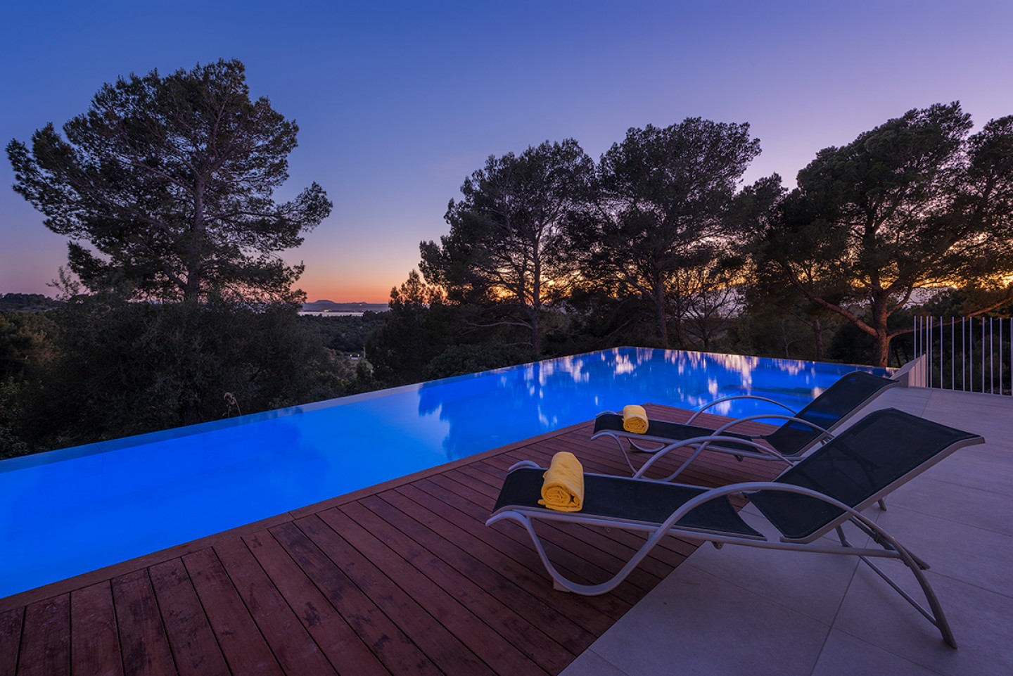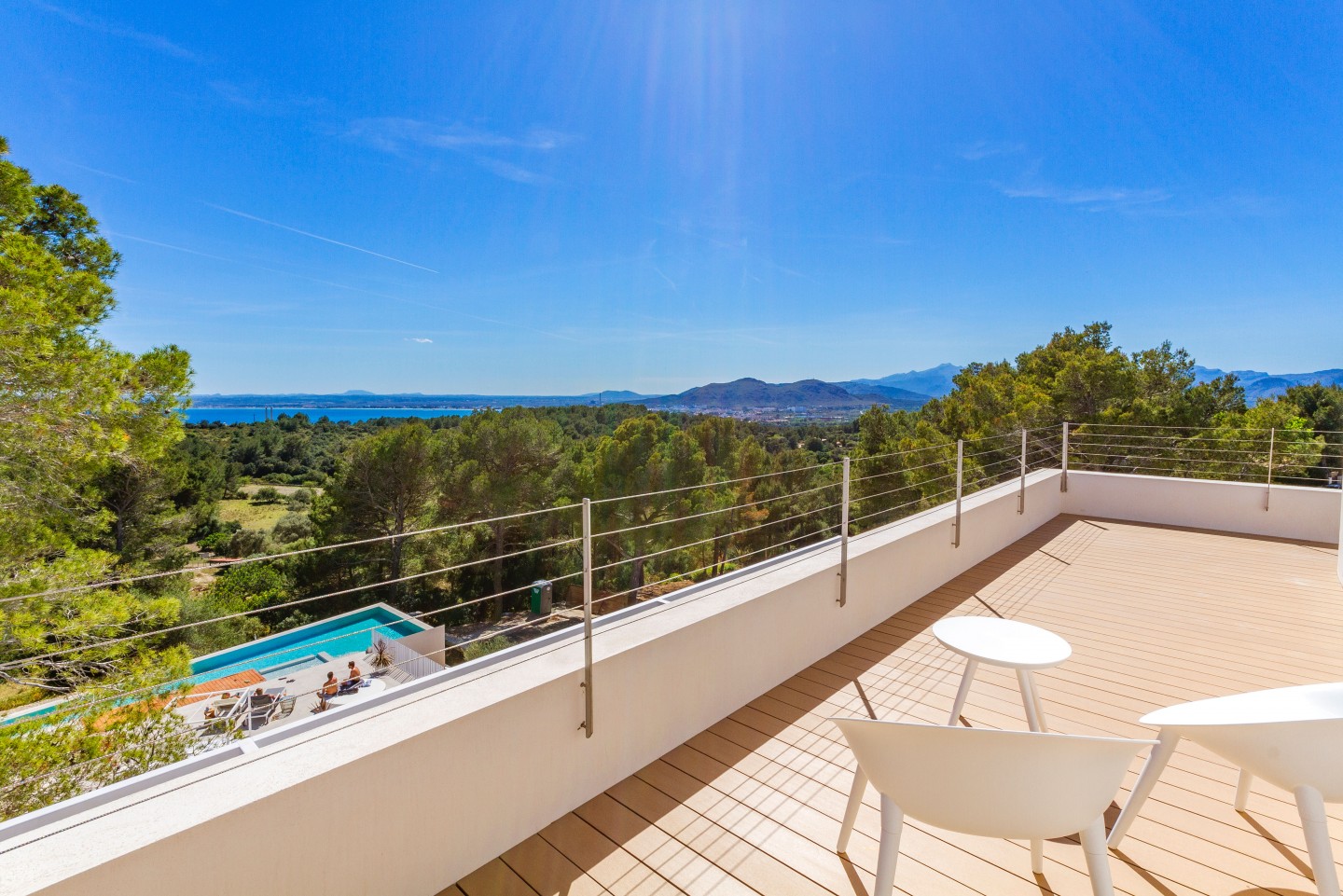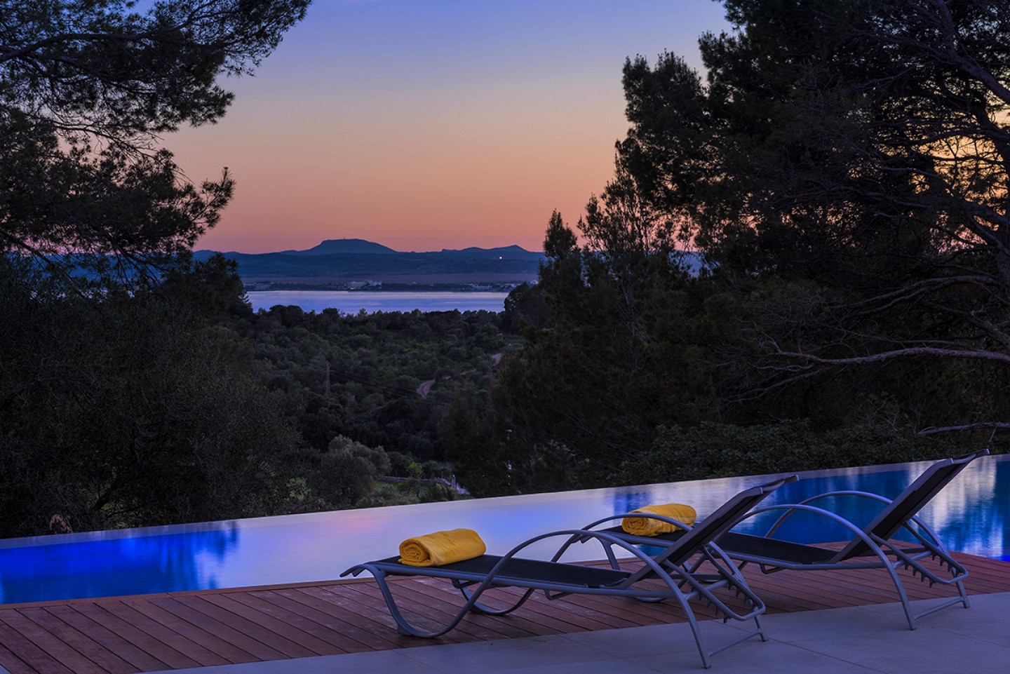 Villa Sky is located in an elevated position and offers a wide view over beautiful forests to the bay of Alcudia. The villa is surrounded by a large terrace and harmonious, well-kept gardens. The infinity pool has a waterfall and a large solarium with lounge chairs and a Balinese day bed. A covered dining area can be found next to the pool. Directly behind the villa is another dining area equipped with a barbecue.