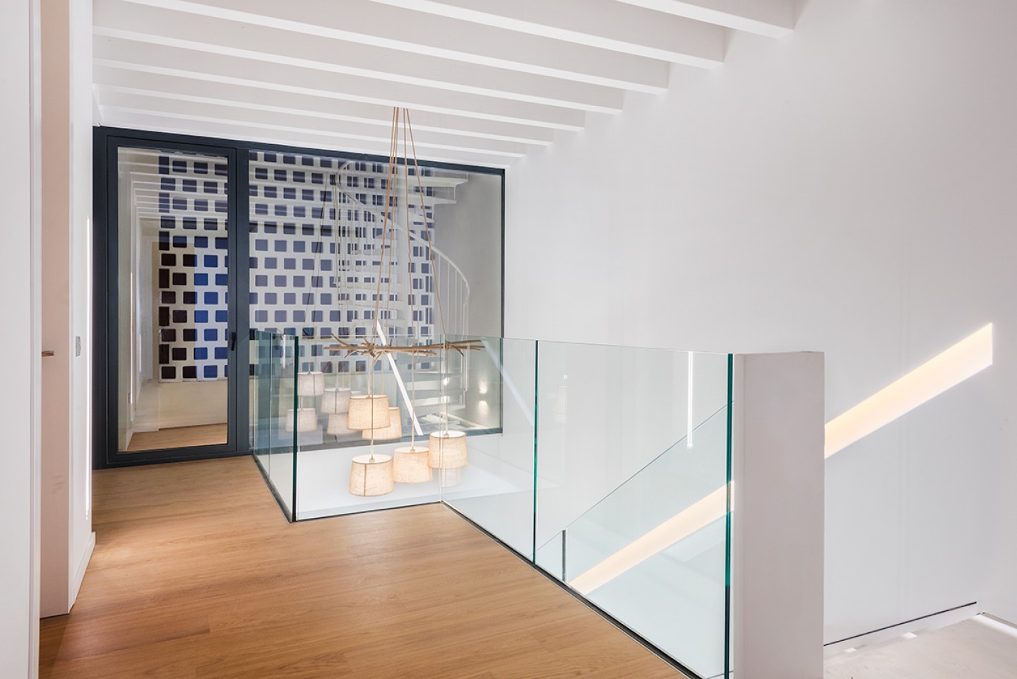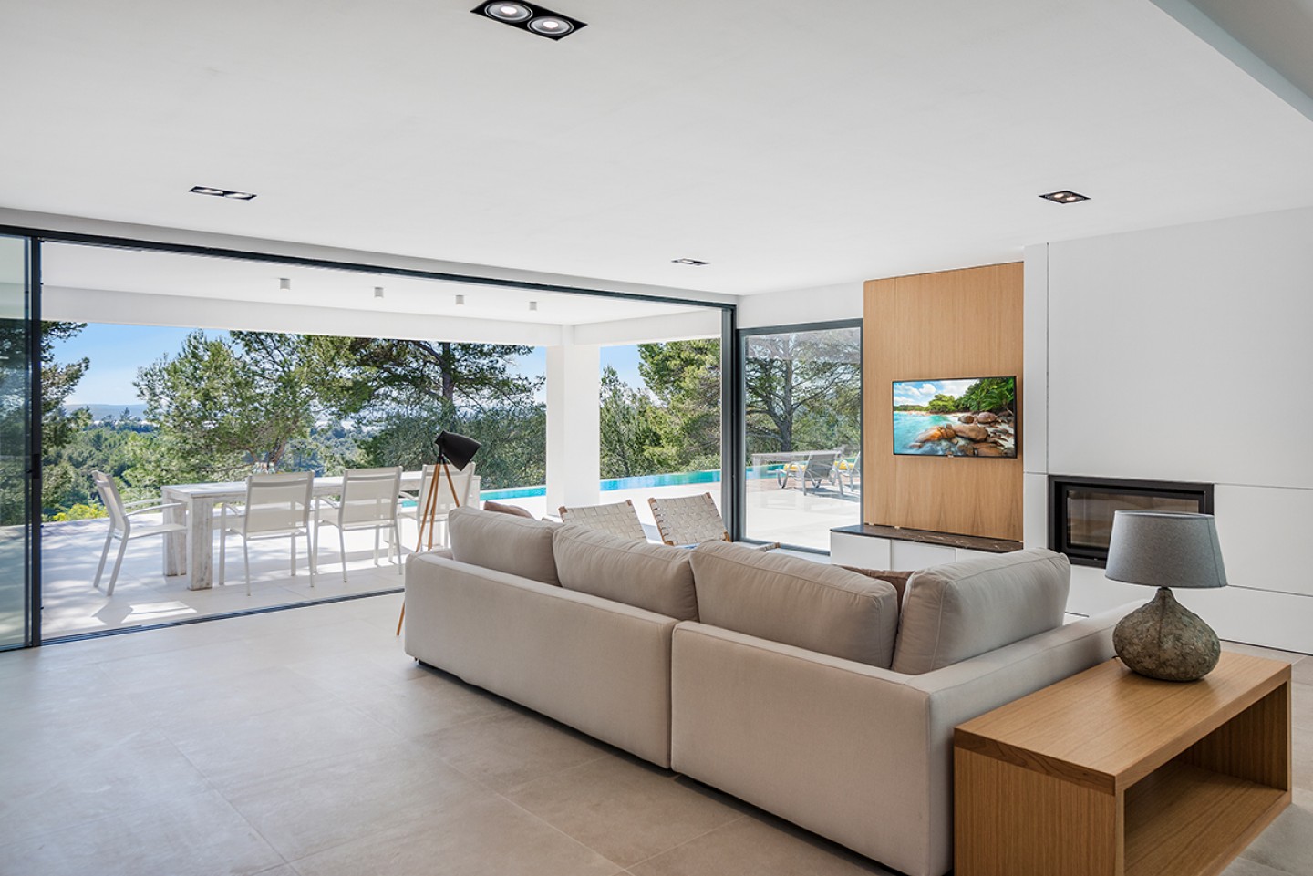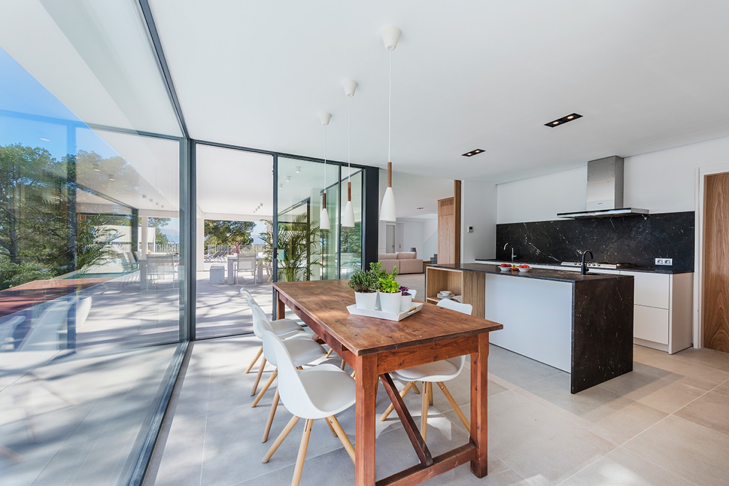 The living and dining room on the ground floor is very spacious and has floor-to-ceiling glass walls that open onto the terrace, garden and pool. The modern, fully equipped kitchen lacks nothing with its large island, two sinks and a dining area. The kitchen can remain open to the living room or can be separated by simply closing a large door.