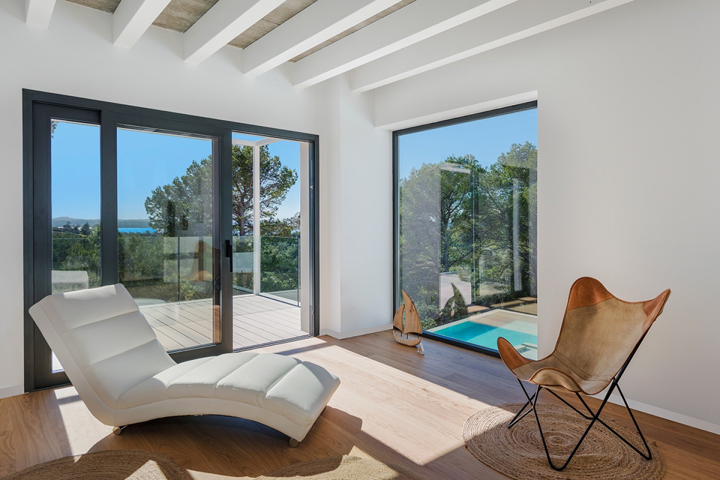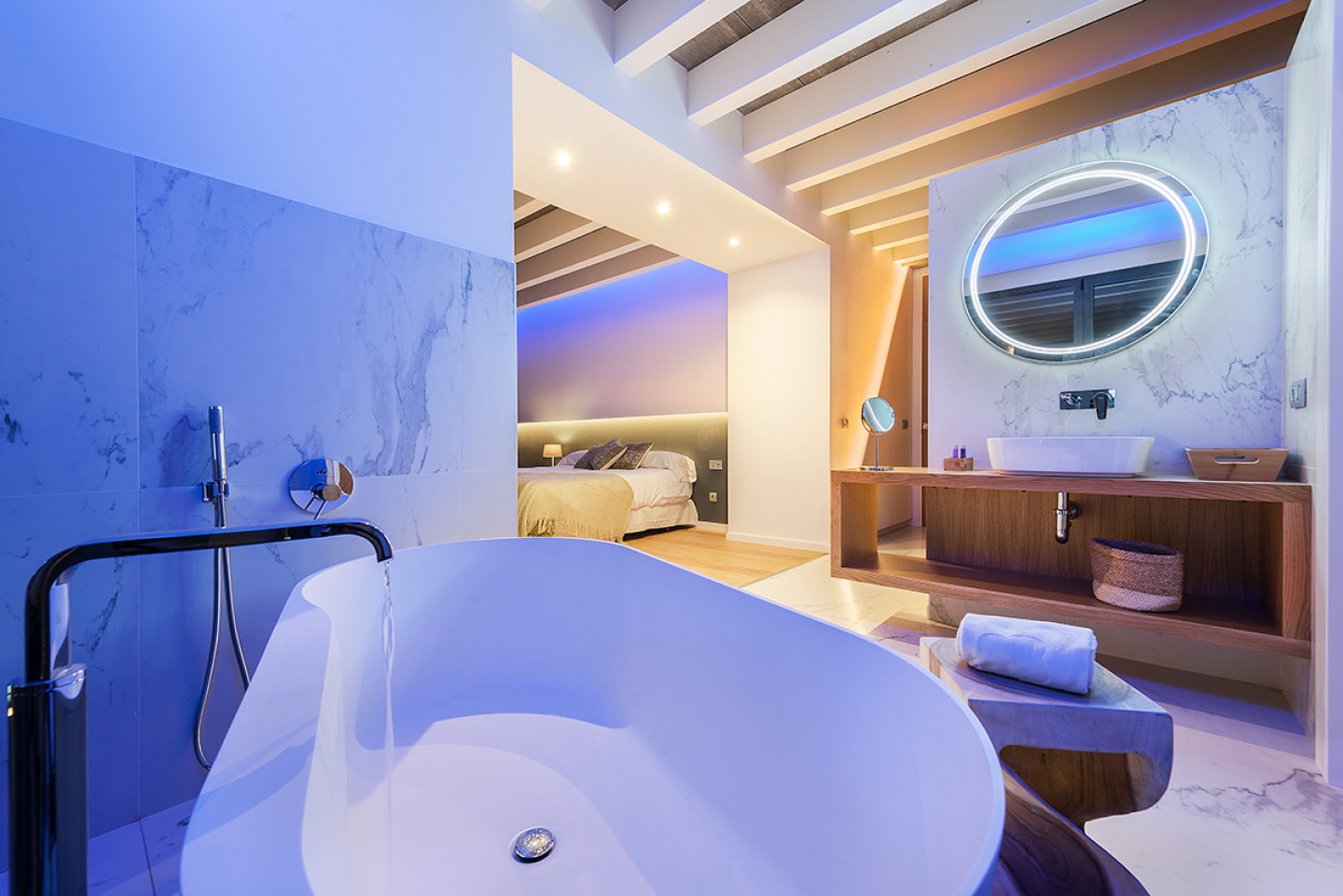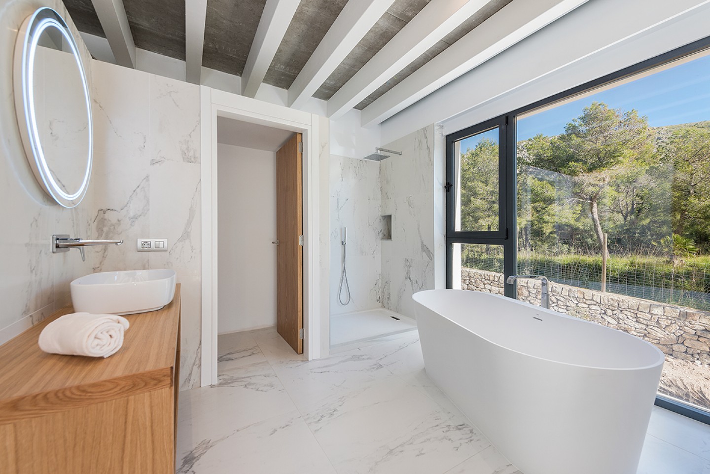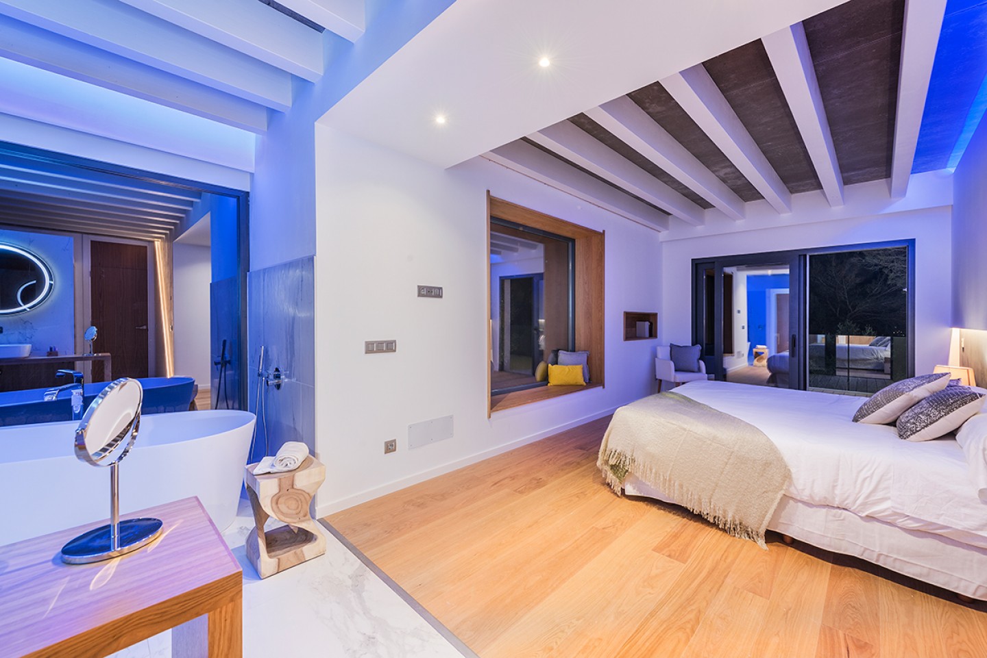 On the ground floor there is a large bedroom with a double bed, wardrobe and bathroom. The bright and spacious master suite on the first floor has a king-size bed, a walk-in closet and offers a wonderful view of the surrounding landscape and mountains. The suite has a freestanding designer bathtub and an open marble shower with its own toilet.