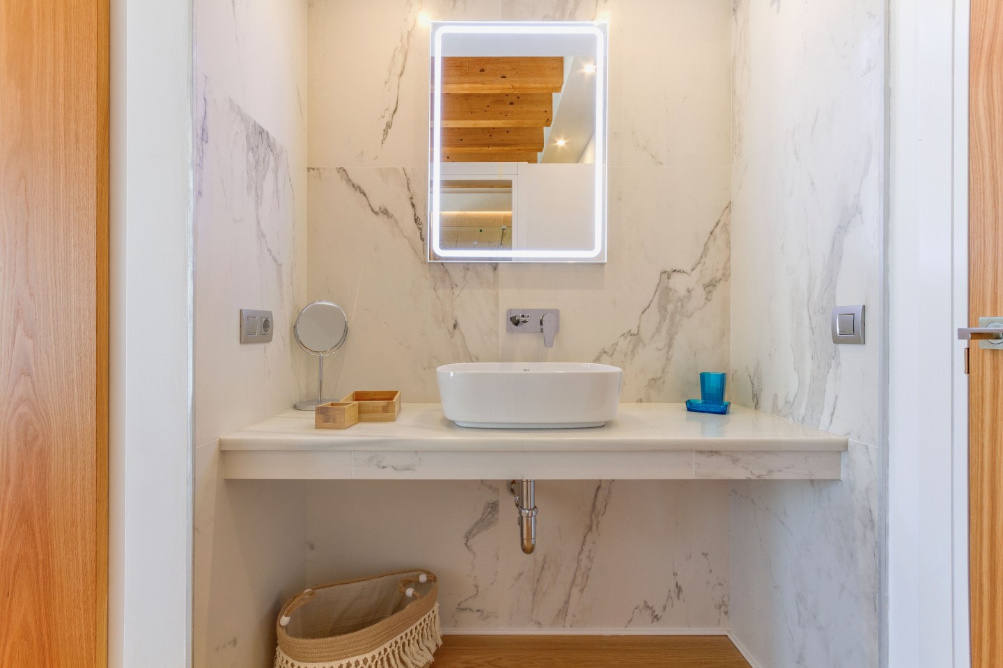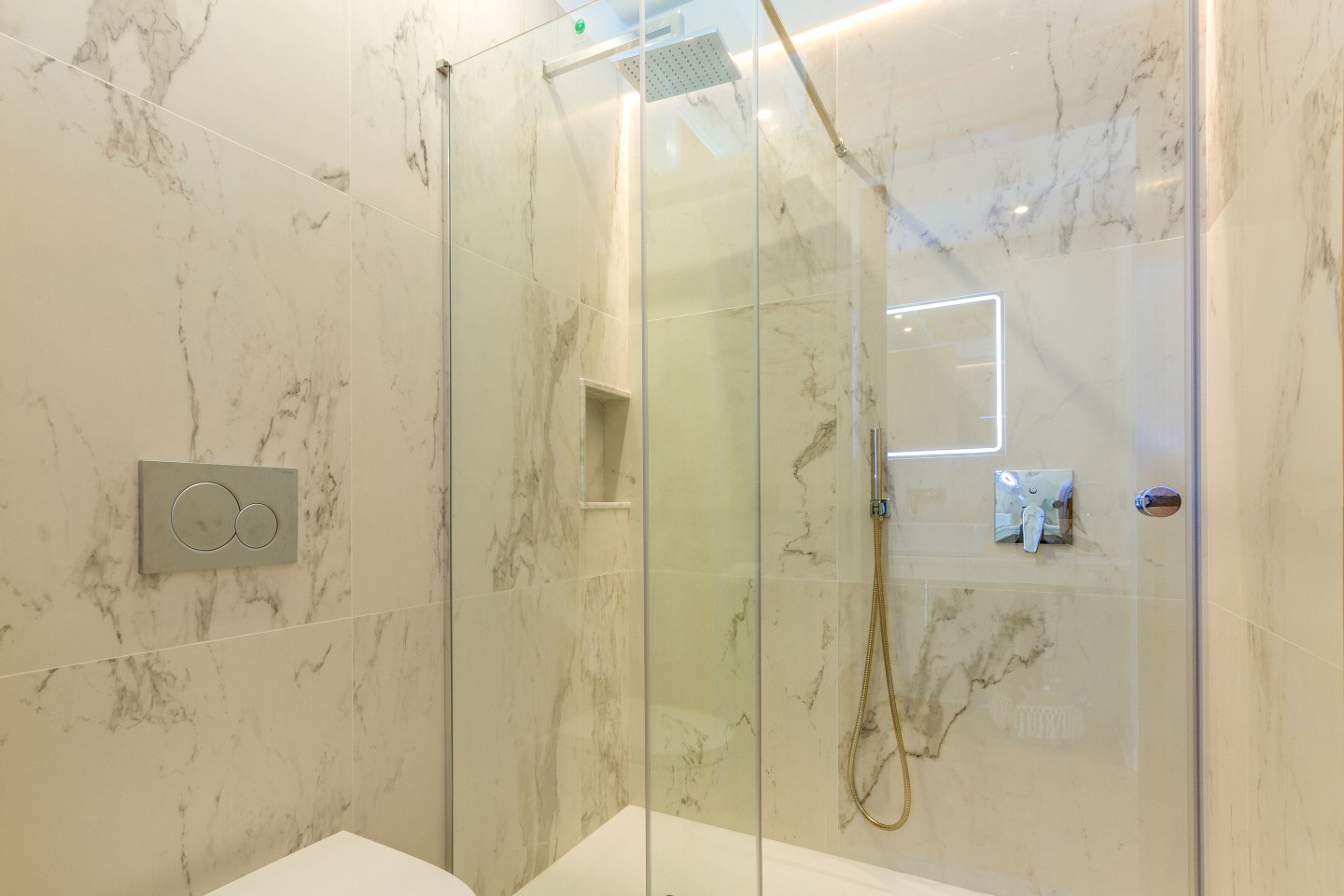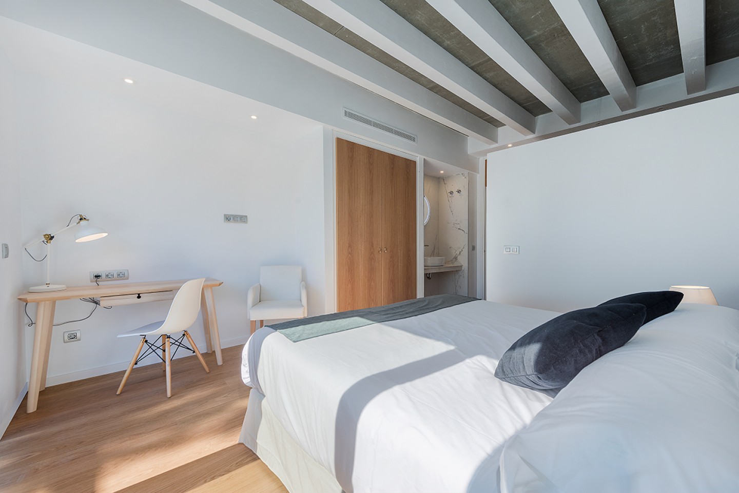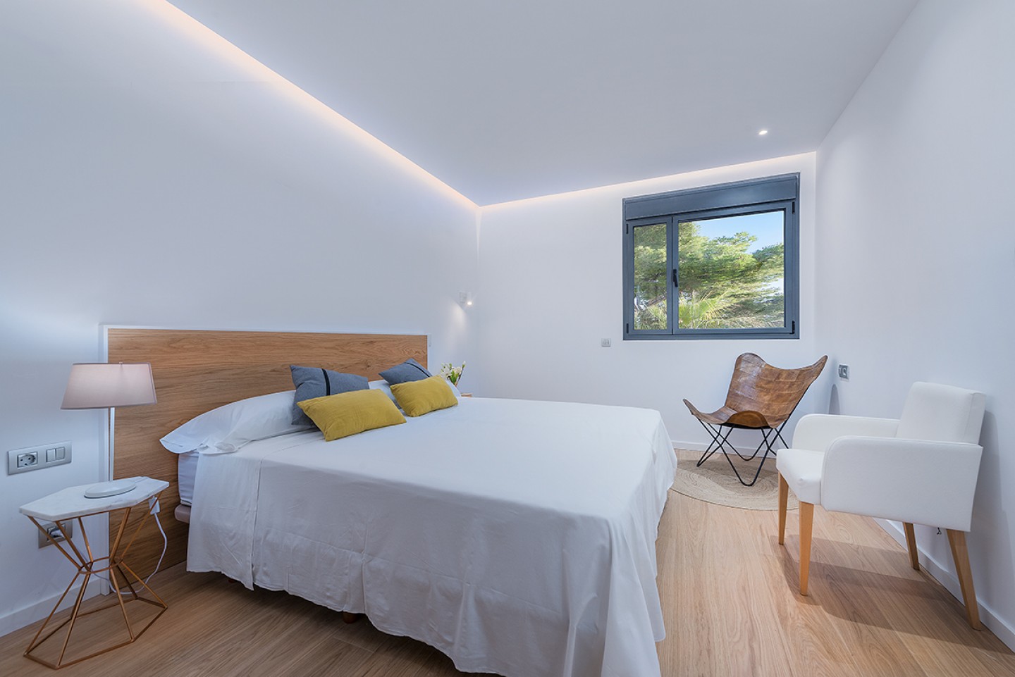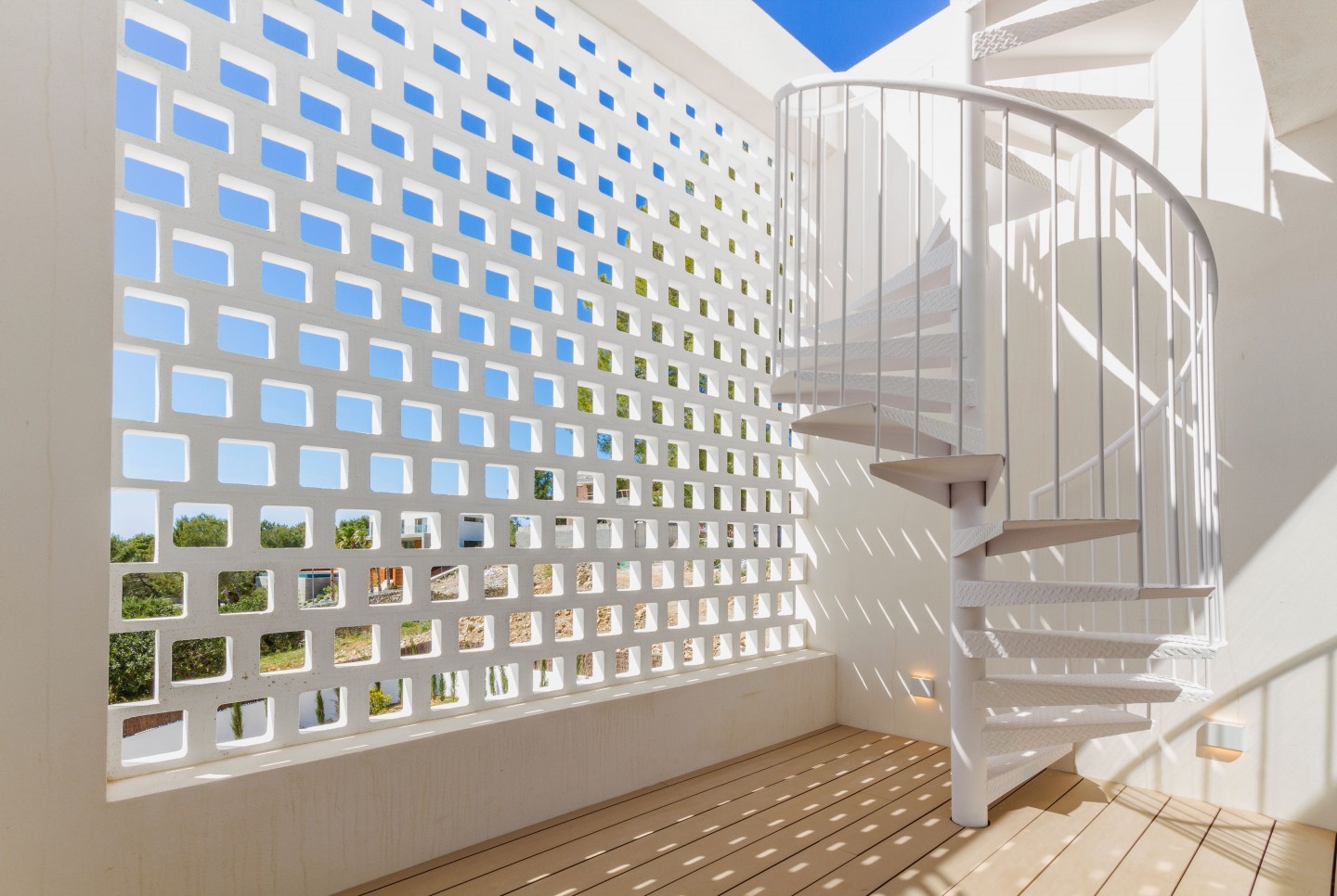 On the ground floor there is a large bedroom with a double bed, wardrobe and bathroom. The bright and spacious master suite on the first floor has a king-size bed, a walk-in closet and offers a wonderful view of the surrounding landscape and mountains. The suite has a freestanding designer bathtub and an open marble shower with its own toilet.